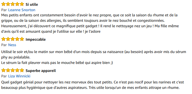 Enfin, Anne, avec son bébé de 5 mois, est pleinement satisfaite de celui-ci, car il est moins encombrant que ce qu’elle pensait. Elle a pu le transporter dans son sac à main afin de l’avoir toujours à portée durant le rhume de son enfant. Nos avis mouche bébé Little Martin’s Drawer sont littéralement très bon, et le rapport qualité prix de ce produit est intéressant pour quiconque souhaite avoir un mouche bébé pas cher et qui réussi à allier performance, simplicité et ergonomie. En voyant le prix d’autres produits comme le mouche-bébé Nosiboo par exemple on ne peut que plébisciter celui-ci ! Ce mouche-bébé est LA bonne surprise de nos tests, on valide complètement son achat.